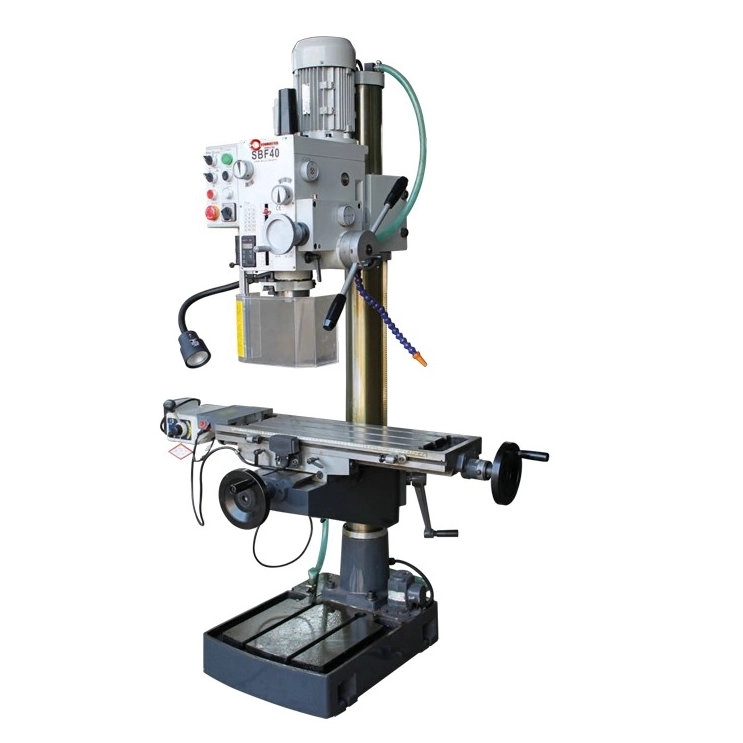 Ähnlich der SBF 32 verfügt die SBF 40 ebenfalls über einen großen Kreuztisch mit automatischen, stufenlos regelbaren Vorschub in der X-Achse zum Koordinatenbohren und für leichte Fräsverarbeitung. Die Maschine überzeugt mit einem laufruhigen Getriebe im geschlossenen Ölbad, und einer robusten Bauweise.