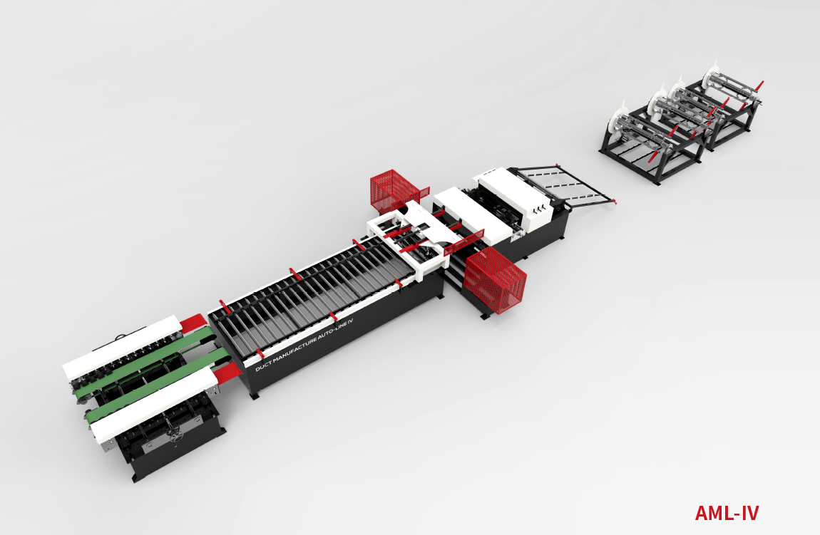 Duct production line Ⅳ composed of a decoiler, leveler grooving unit, “V” and “口” notching unit, cutting unit, bending unit,reciprocating lock former unit, feed extraman unit, duplex flange (angle iron & TDF) composition, The entire production process is controlled by the servo system is completed.