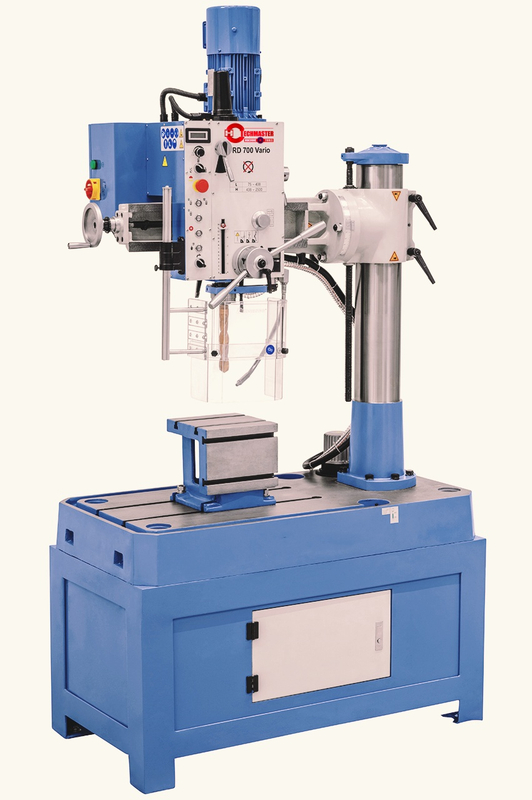 The RD 700 Vario is a heavy radial drilling machine featuring stepless speed adjustment, automatic spindle feed and a digital speed display. For an extended range of applications, the machine also has a pivoting support arm (± 45°).